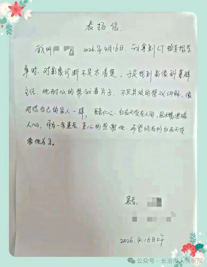 影像无声,医者有情。患者的认可,是前行的动力,更是奋进的鞭策。未来,长治市人民医院影像中心将继续把专业融入细节,把温暖融入服务,以赤诚初心守护群众健康,让黑白影像背后,始终有温情相伴。